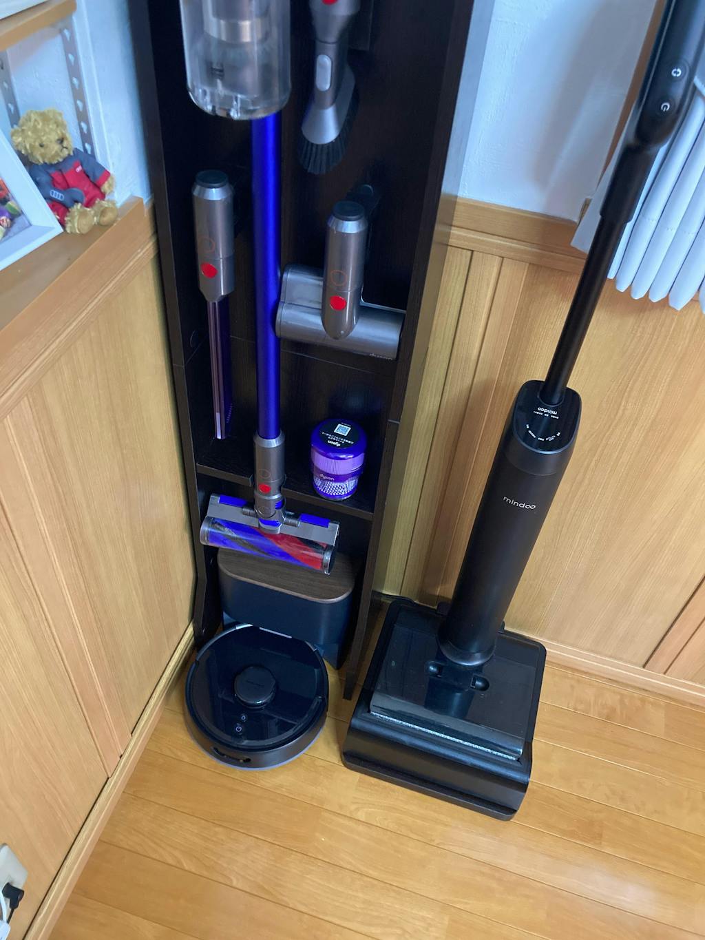 高さ24cm×幅18cmの超コンパクト設計。家具の下や階段の裏など、お家のちょっとした空きスペースにスッと置けて、邪魔になりません。4Lの超大容量抗菌紙パックを内蔵し、ゴミ捨ては年に4回だけ。カラーはホワイトとブラック(発売予定)の2色展開。浅い木目調のぬくもりあるデザインで、どんなインテリアにも自然に馴染み、生活空間にしっくり溶け込みます。